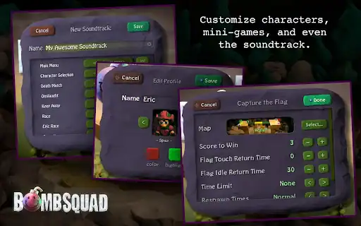 وقتی BombSquad رو باز می کنید، گرافیک سه بعدی و طراحی شادش حسابی شما رو می گیره. شخصیت های بامزه مثل نینجا، دزد دریایی، خرس یا سرباز، هرکدوم یه حس خاص به بازی می دن. کنترل ها خیلی راحت ان؛ با یه جوی استیک مجازی حرکت می کنید و با چند دکمه بمب می ندازید، مشت می زنید یا می پرید. صداگذاری خنده دار و موسیقی پرانرژی هم کاری می کنه که کامل توی فضای بازی غرق بشید.